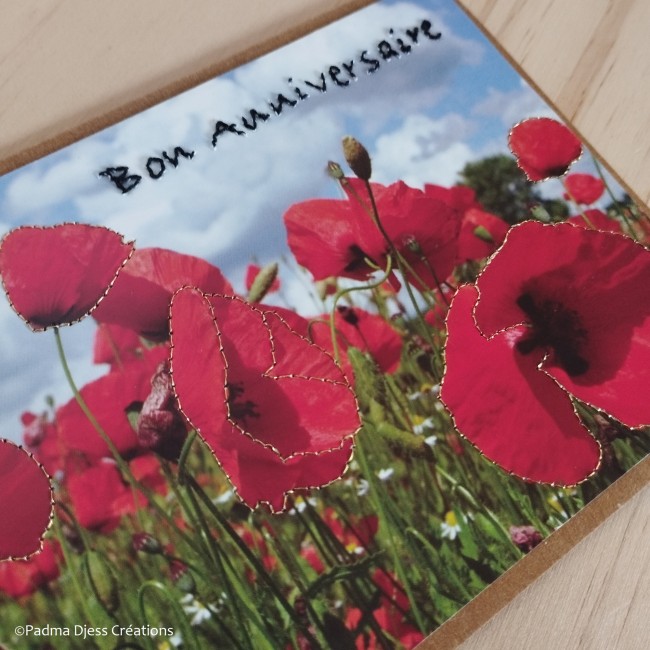 J'ai brodé quelque coquelicot au fil doré pour donner du relief et en haut, j'ai ajouté une broderie "Bon anniversaire" en noir.