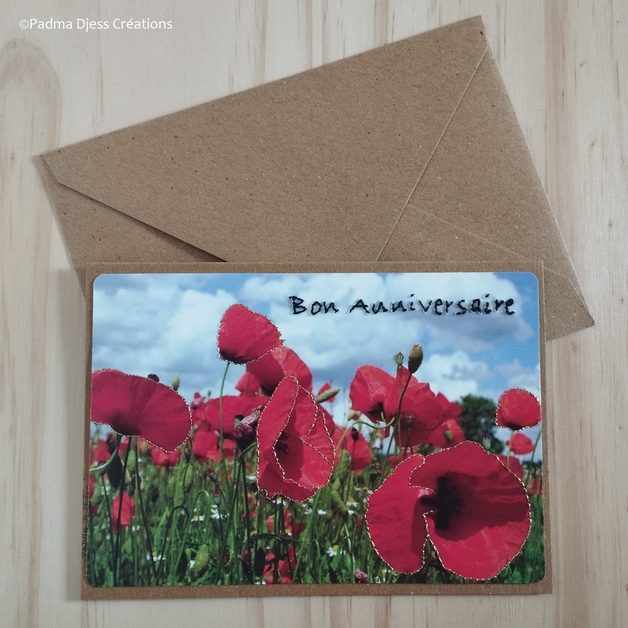 Carte d'anniversaire brodé avec un beau champ de coquelicots.