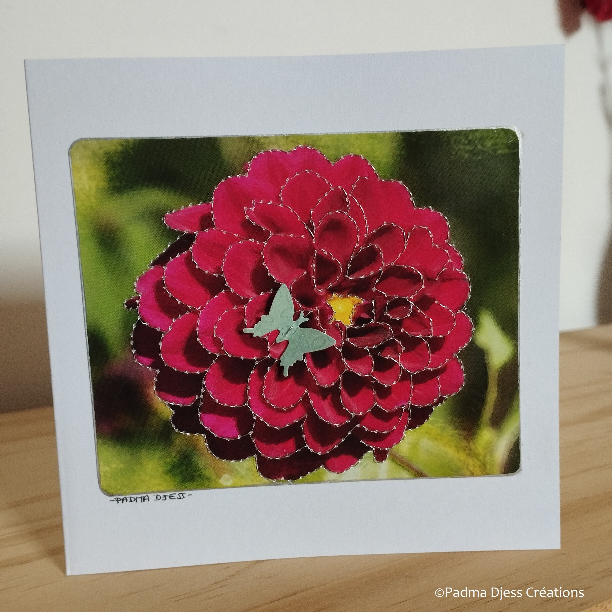 Carte à offrir brodé avec une fleur de Dahlia en gros plan.