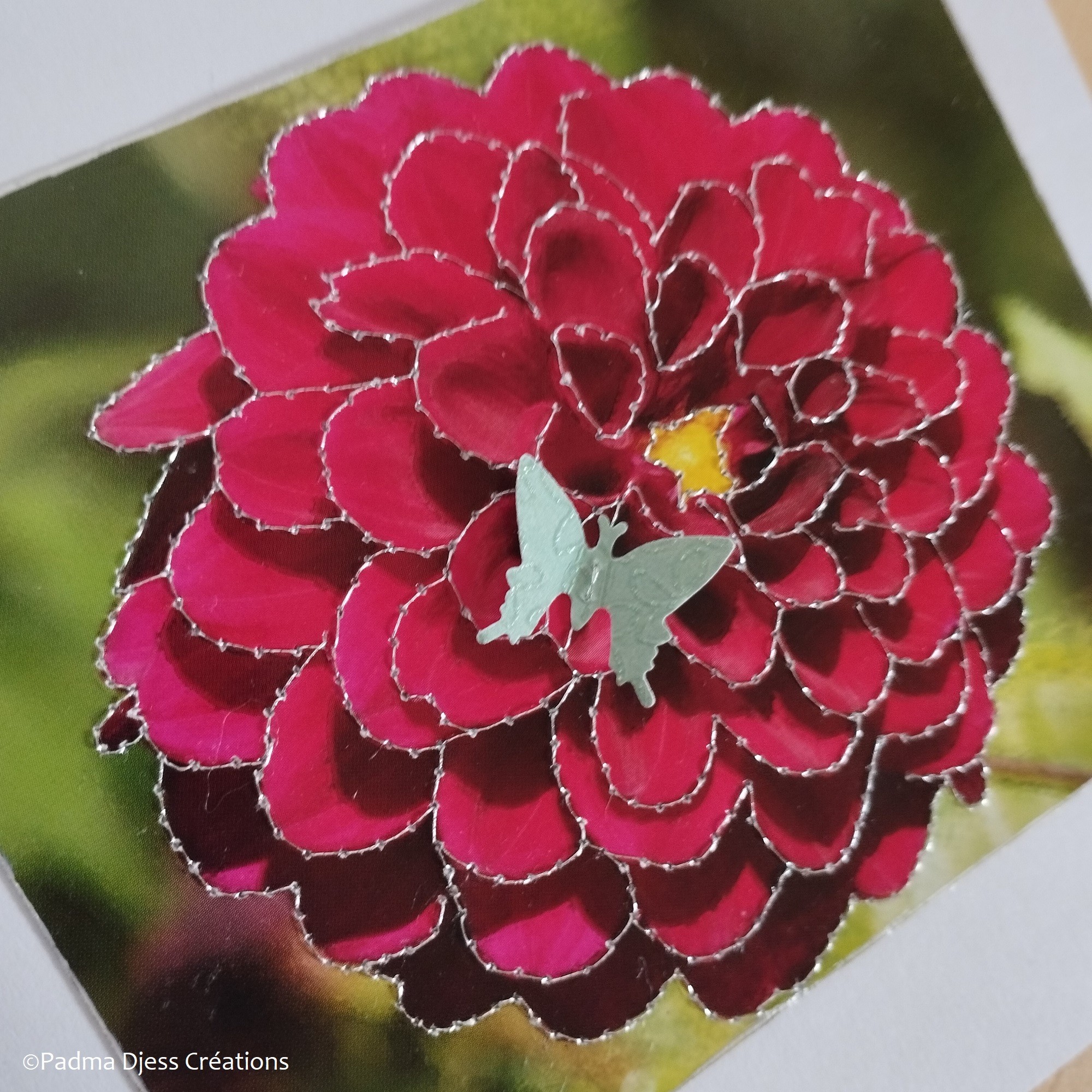 J'ai ajouté sur la fleur un petit papillon de papier brodé au centre.