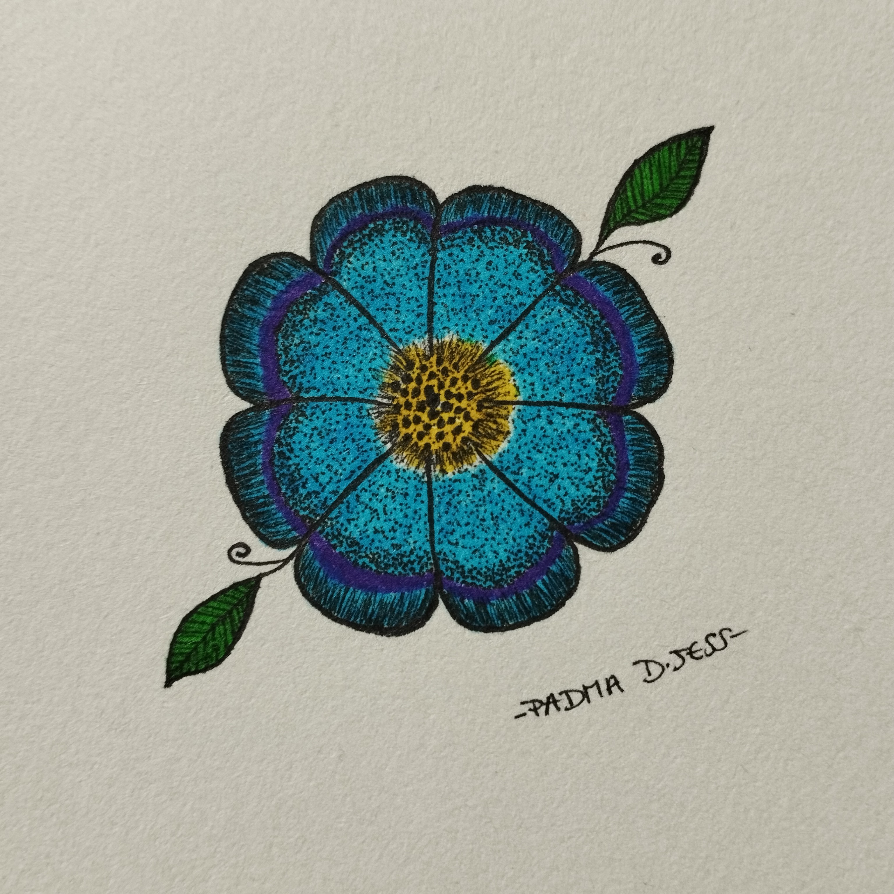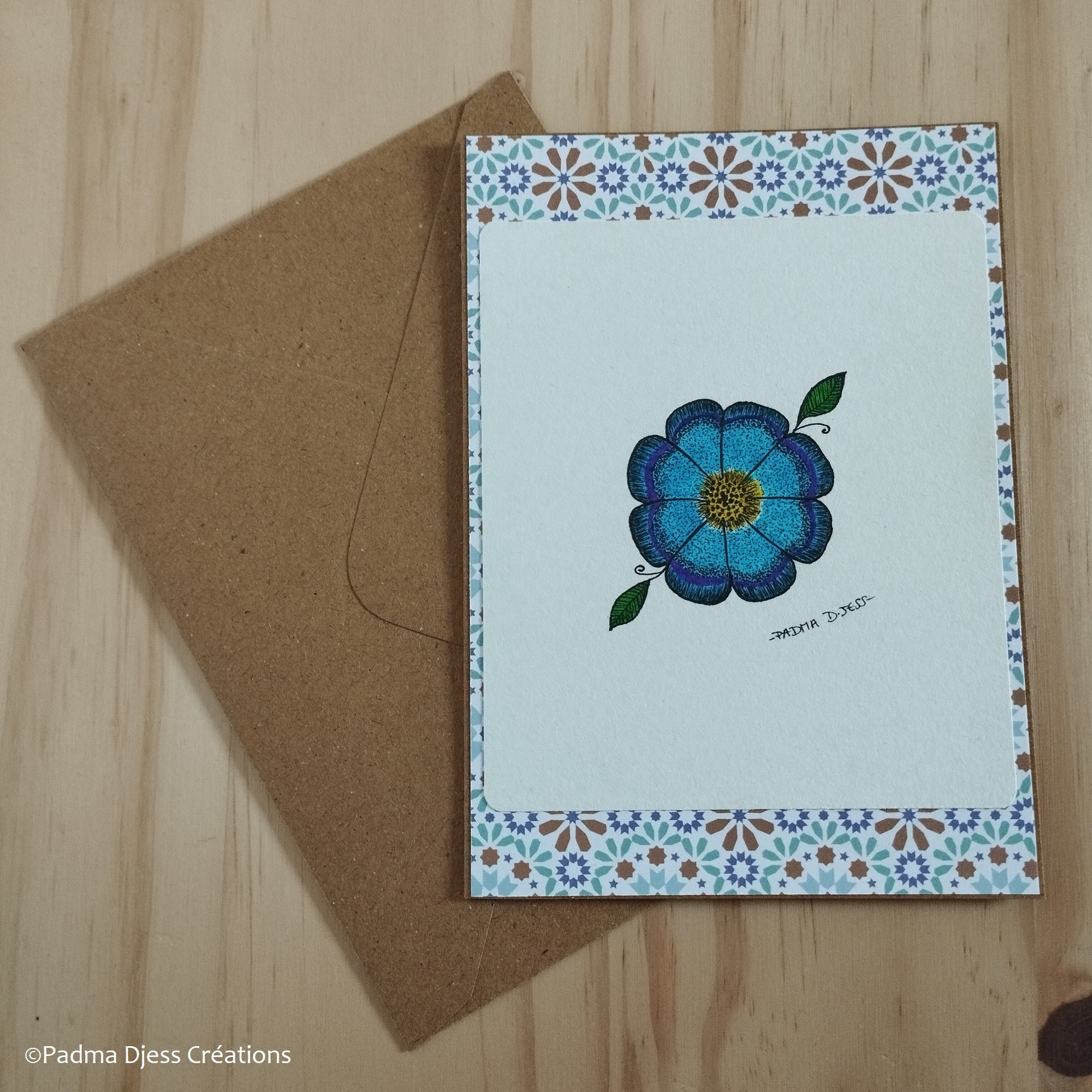 La fleur est dessinée sur du papier blanc, collée sur du papier décoratif marron et bleu.