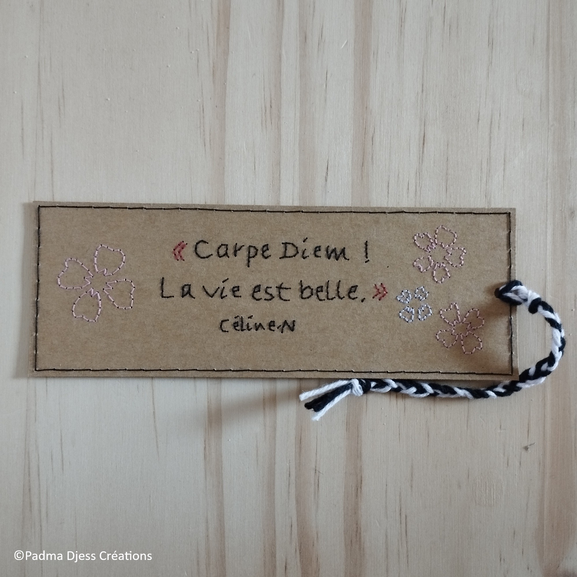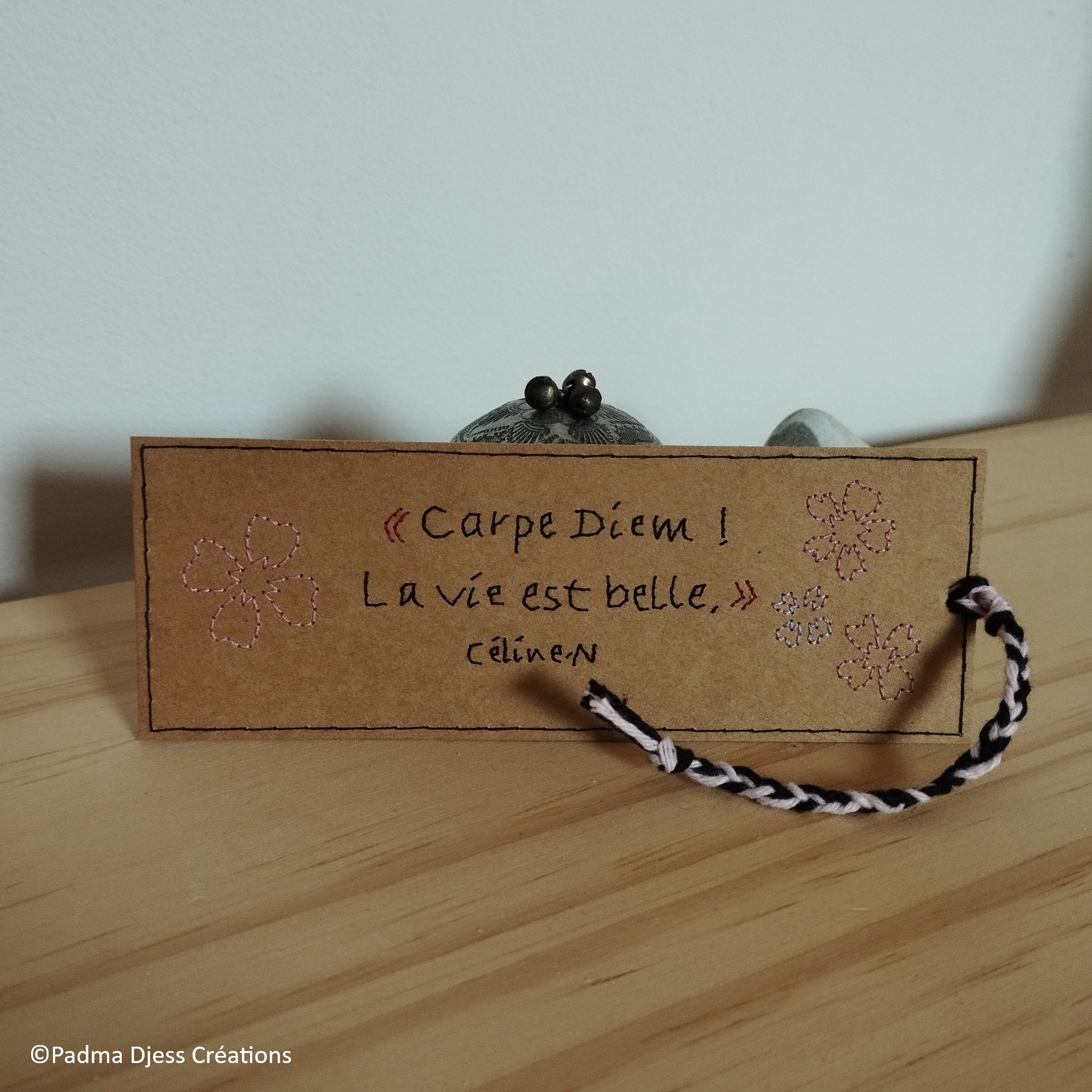 Marque-page avec citation brodé au fil noir, "Carpe Diem" De Céline N