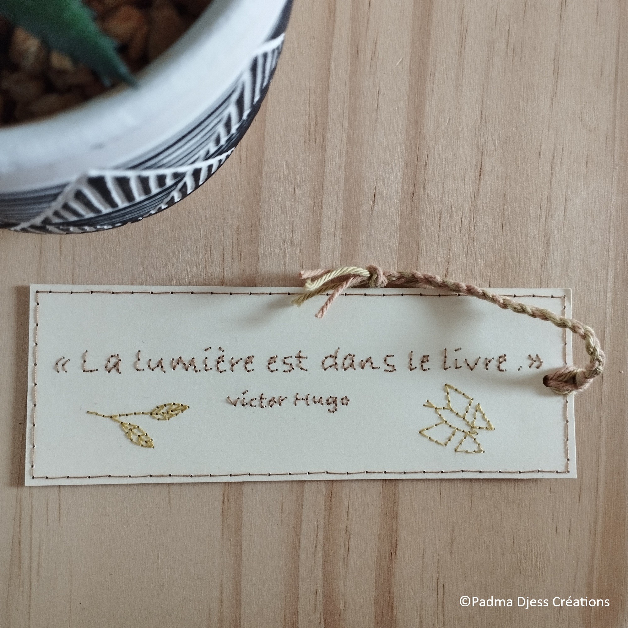 Marque-page avec citation brodé au fil marron clair, "La lumière est dans le livre" De Victor Hugo
