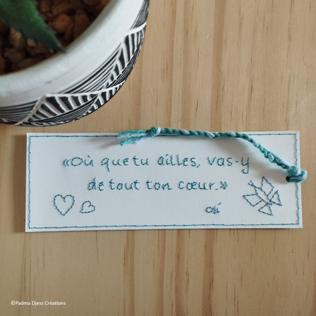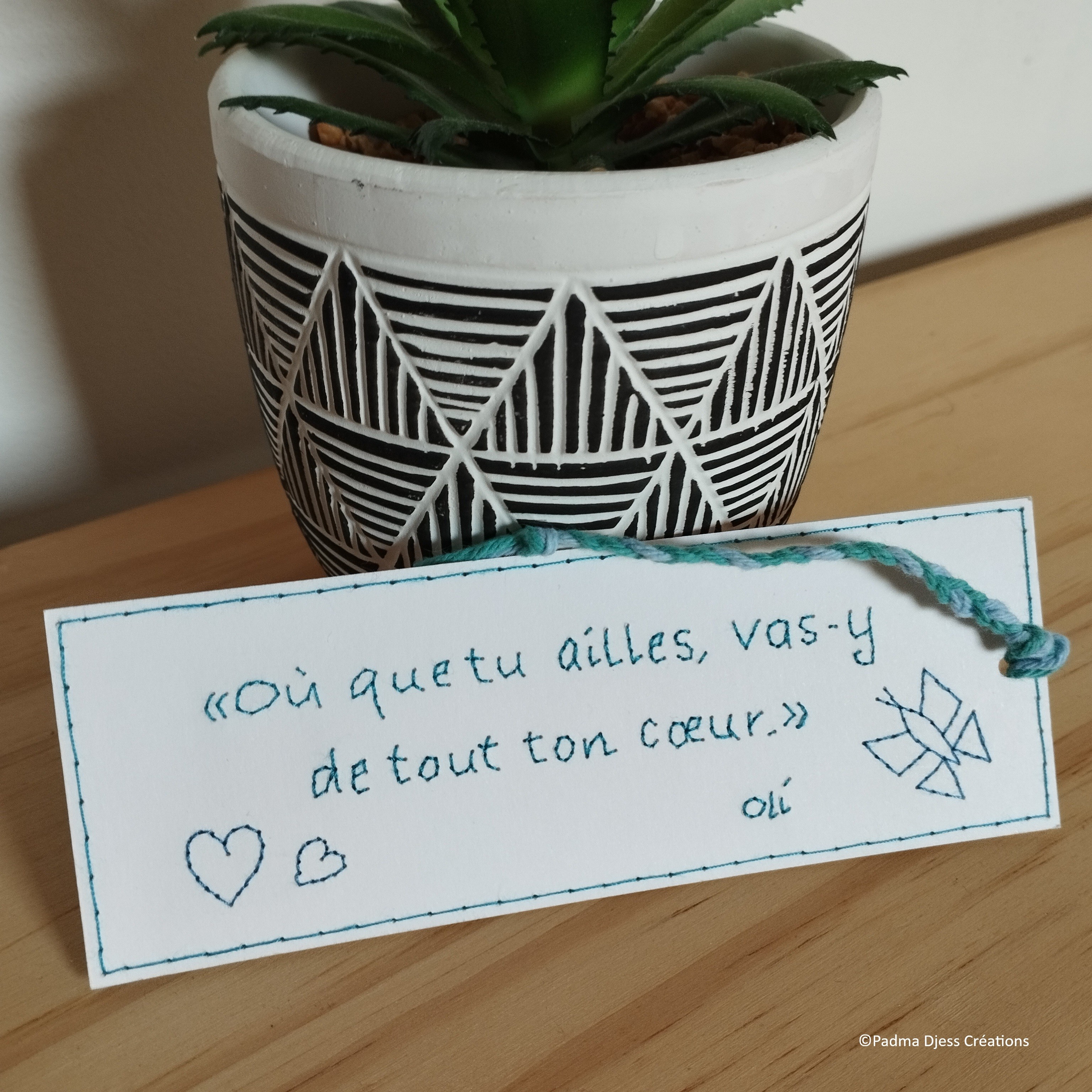 Marque-page avec citation brodé au fil bleu, "Où que tu ailles, vas-y de tout ton cœur." De Oli