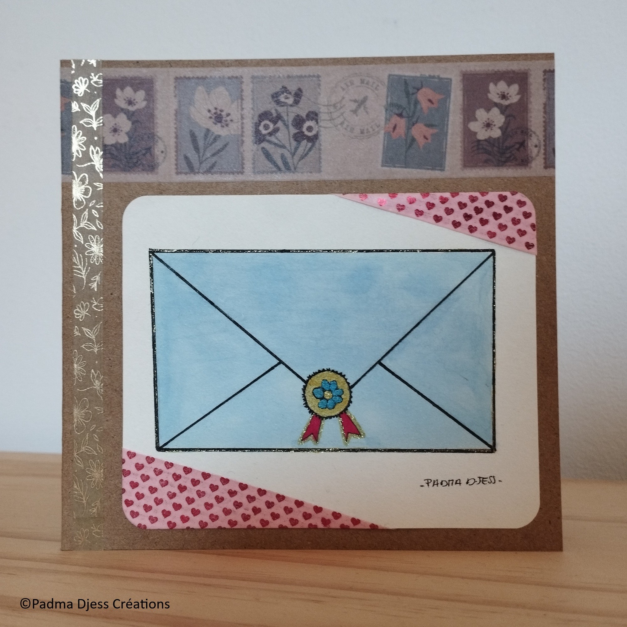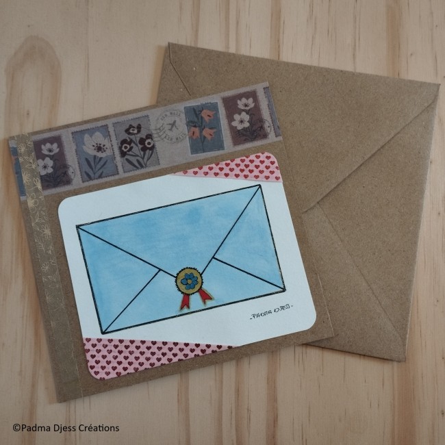 L'enveloppe est dessinée sur du papier blanc, collée sur du papier kraft marron.